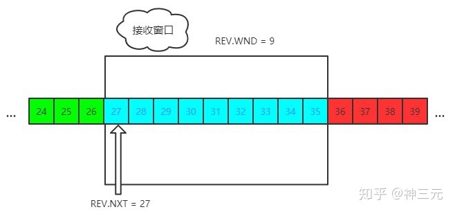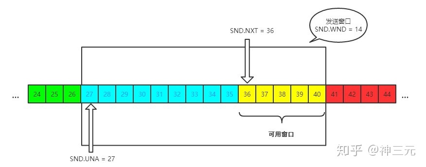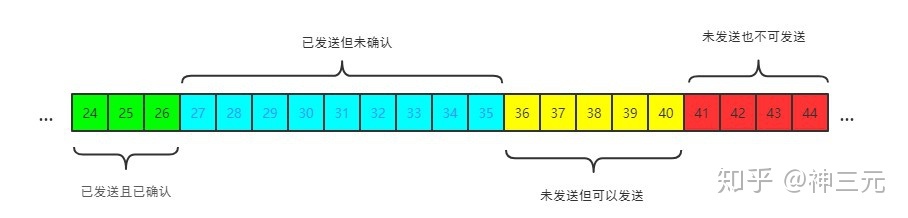 其中包含四大部分: - 已发送且已确认 - 已发送但未确认 - 未发送但可以发送 - 未发送也不可以发送