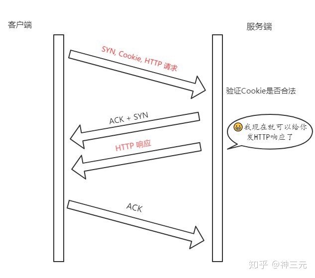 在后面的三次握手中,客户端会将之前缓存的 Cookie、SYN 和HTTP请求(是的,你没看错)发送给服务端,服务端验证了 Cookie 的合法性,如果不合法直接丢弃;如果是合法的,那么就正常返回SYN + ACK。