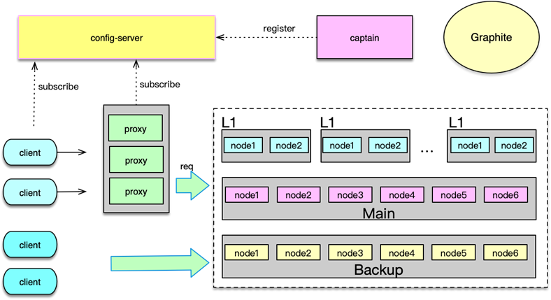 在突发热点事件发生,大量用户上线并集中访问、发表 Feed,并且会对部分 Feed 进行超高并发的访问,总体流量增加 1 倍以上,热点数据所在的缓存节点流量增加数倍,此时需要能够快速增加多组 L1,从而快速分散这个节点数据的访问。另外在任何一层,如果有节点机器故障,也需要使用其他机器替代。这样三层 Mc 架构,时常需要进行一些变更。微博的 Mc 架构配置存放在配置中心 config-server 中,由 captain 进行管理。proxy、client 启动时读取并订阅这些配置,在 Mc 部署变更时,可以及时自动切换连接。